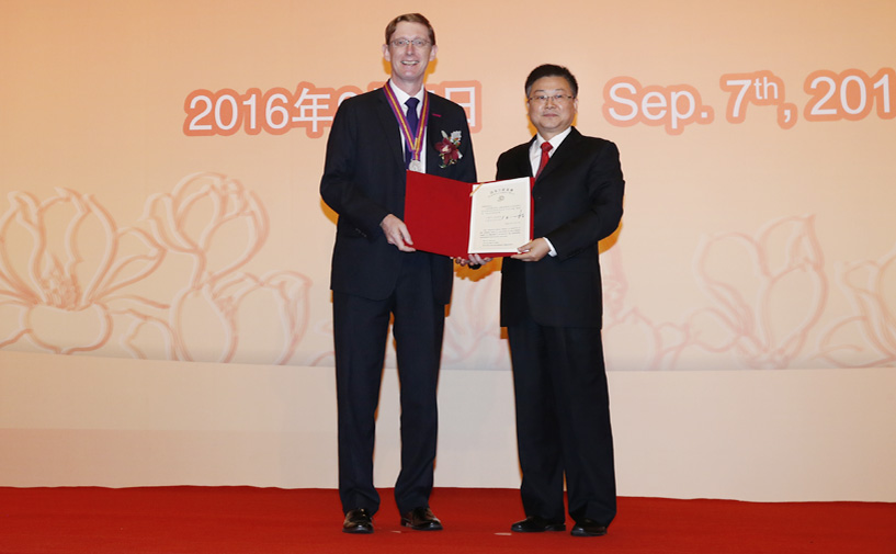 上海市政府外办主任张小松向赫拉德·范斯海克授予“白玉兰纪念奖”奖牌和证书 |